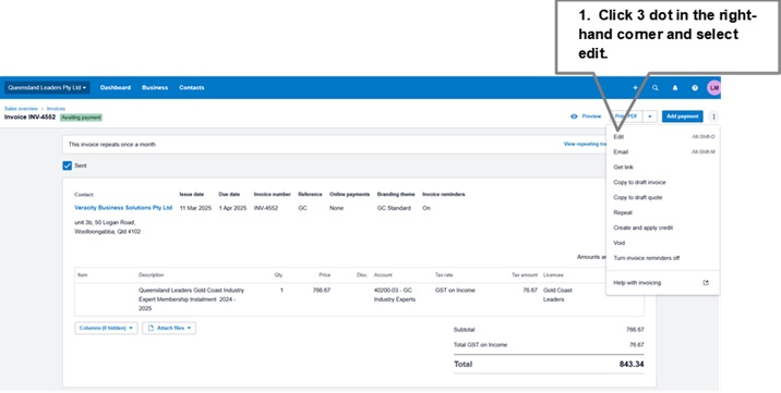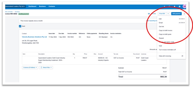- Open the original invoice from the 3 dots in the right-hand corner, select Repeat