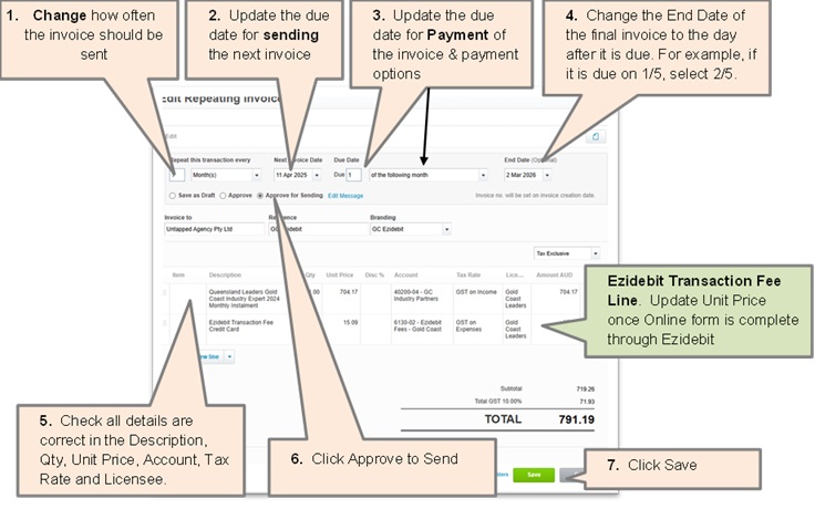 - When an Ezidebit Form is completed online by the Member. Return to the current invoice and recurring invoice and updated the following areas (see how to edit invoice section)