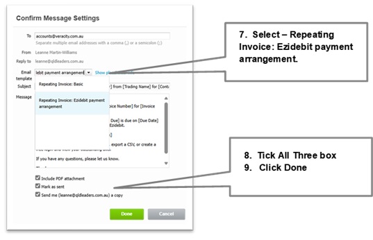 - On Email Template Select: Repeating Invoice – Ezidebit Payment Arrangement.